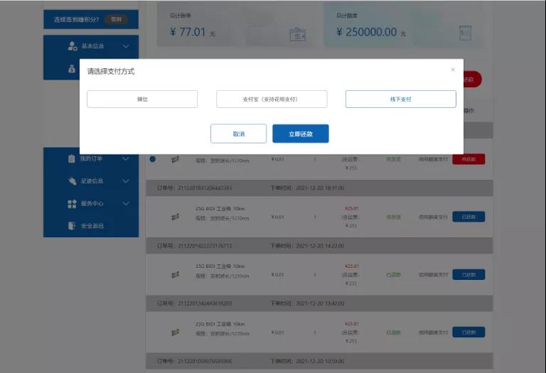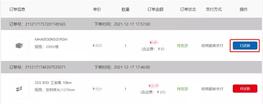 2、 使用额度支付的订单,已还款的订单售后申请通过后,则退还对应订单的金额到付款时所使用的方式账户。