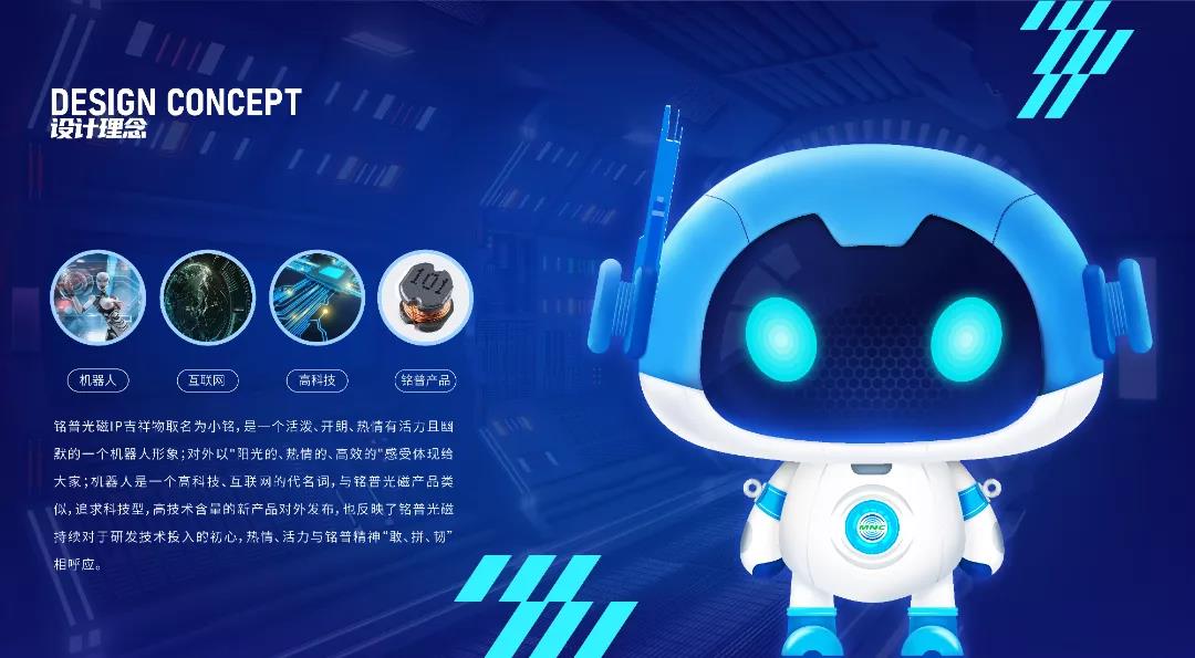 ■ 设计理念:机器人是高科技、互联网的代名词,与铭普光磁产品类似,追求以科技型、高技术含量的新产品对外发布。我的形象反映了铭普光磁对于研发技术持续投入的初心,同时我的热情、活力与铭普精神“敢、拼、韧”相呼应。