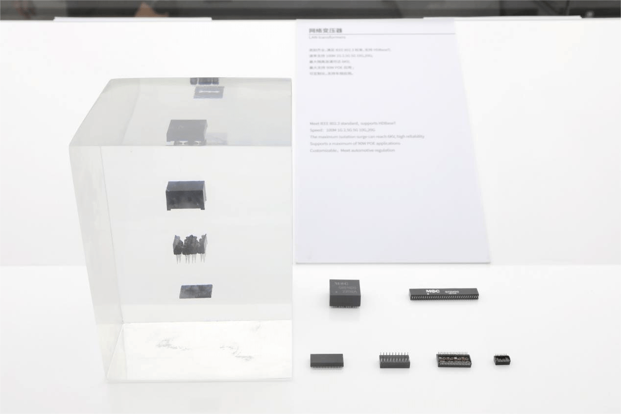 杨先进介绍,多年的探索与积累,铭普的业务如今成长为四大板块。首先是创业伊始的“磁”,即磁性元器件,产品涵盖通信类和功率类两大系列,包括网络变压器、功率变压器、功率电感,车用磁性元件等;紧接着则是“光”,即光模块和光器件。这两个模块构成了铭普的业务根基,也正体现在“铭普光磁”的名号之中。