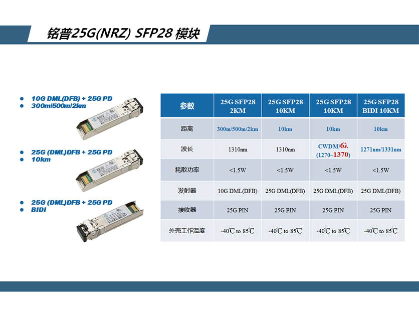 注1:铭普6波CWDM 25G创新设计方案,即用于5G移动前传网络的无源波分子系统,将6路波长复用到一根光纤上传输,相比4波系统光纤使用效率提升100%,模块产品适应-40~90℃的工业扩展温度范围,同时具备低时延、低抖动以及低功耗等特点。