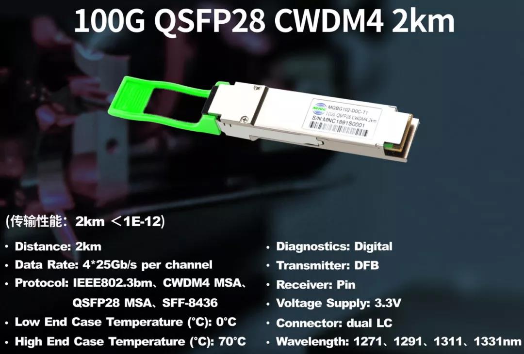 铭普光磁会展出全新研发的100G CWDM4 & 400G SR8/FR4产品,相较于目前市面上已有的100G CWDM4产品,铭普光磁最新推出的100G CWDM4 2km产品有以下几点优势: