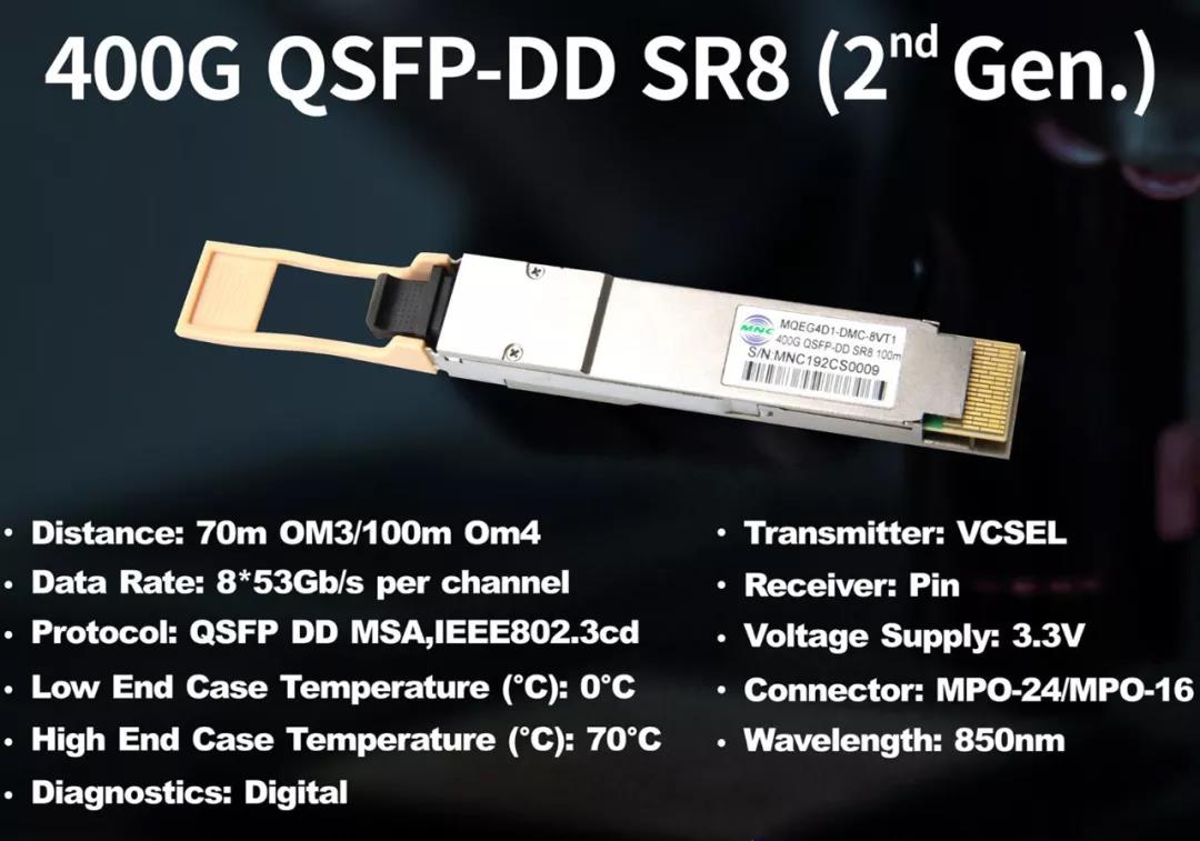 相对于我司在上一届CIOE展会已发布亮相的400G SR8产品,于本届光博会同期上市的第二代400GSR8产品。