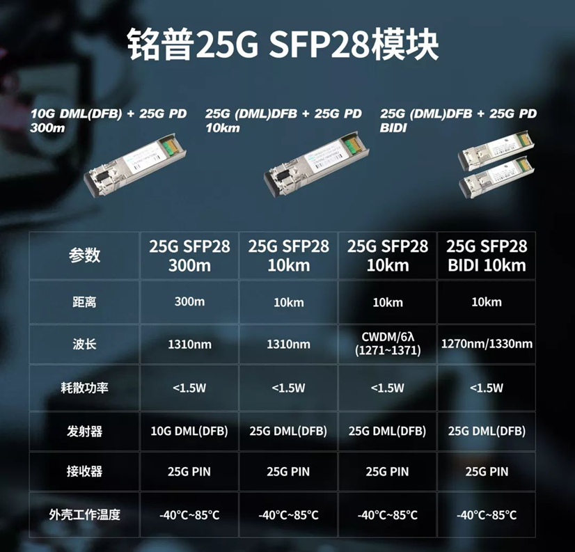 我们很荣幸的向您推荐我们全新研发的25G全系列SFP28产品,针对国内新近发布的5G牌照,使得原本火热的5G建设进入了更加高速的增长期。