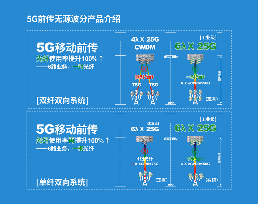 以及完整的无源波分产品解决方案,希望能够通过我们的产品和解决方案, 使得您的目标5G前传网络在光纤资源使用率上,能够得到100%~200%的提升。