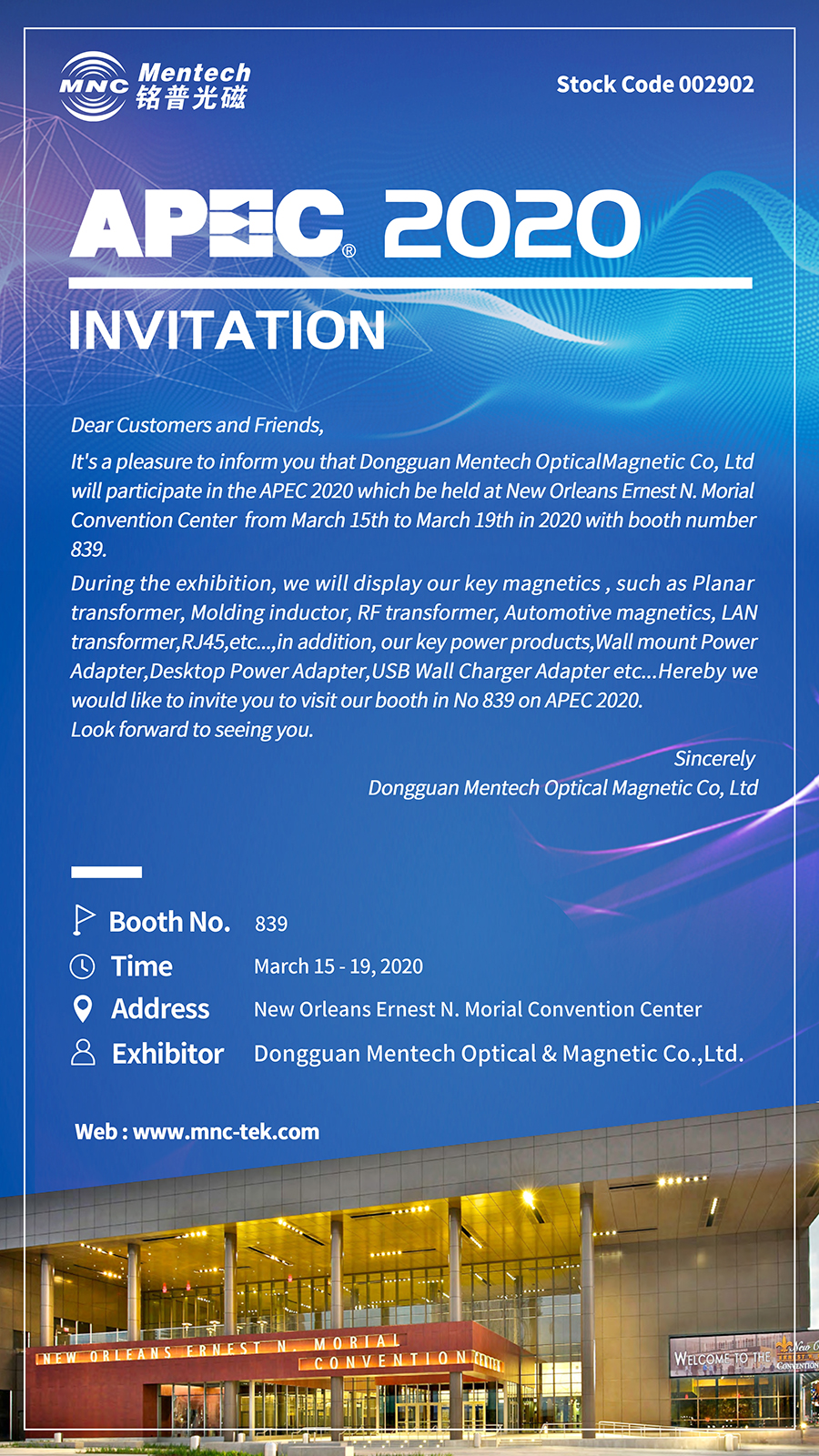 铭普光磁将如期赴约2020年03月15日-03月19日在路易斯安那州的新奥尔良举办的美国国际电力电子应用展览会。(APEC2020)